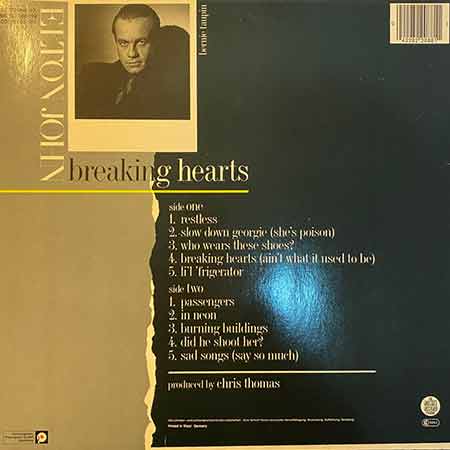 «Breaking Hearts»  (Elton John ) Елтона Джона — це студійний альбом 1984 року, який демонструє його унікальний талант і багатогранність як співака та автора пісень. В альбомі десять треків, у тому числі хіти «Sad Songs (Say So Much)» і «Who Wears These Shoes».