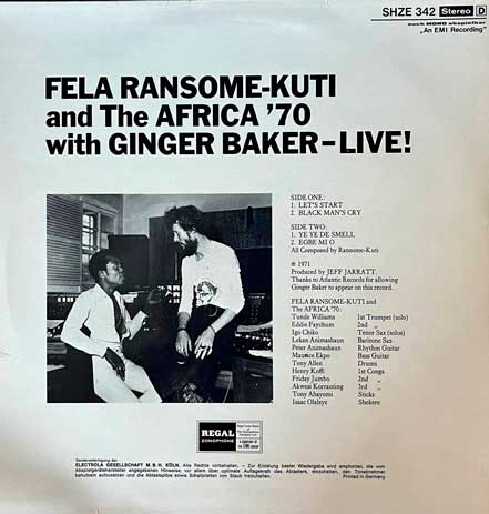 Трекліст включає Let’s Start, Black Man’s Cry, Ye Ye De Smell і Egbe Mi O (Carry Me I Want To Die) – кожен трек пронизаний потужними вокалами Фели, віртуозними саксофонними соло та багатошаровими перкусіями. Участь Бейкера особливо помітна в Ye Ye De Smell, де його барабанні соло гармонійно переплітаються з ритмами Тоні Аллена. CD-перевидання включає бонусний 16-хвилинний барабанний дует Бейкера й Аллена з Берлінського джазового фестивалю 1978 року. Альбом увійшов до списку 50 найкращих концертних альбомів Rolling Stone та книги 1001 Albums You Must Hear Before You Die.