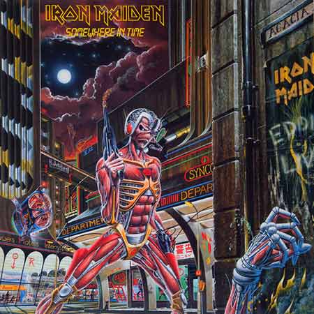Обкладинка Somewhere in Time, створена тоді постійним художником групи Дереком Ріггсом, зображує м’язистого кіборга Едді у футуристичній обстановці, натхненій Ті, що біжать по лезу. Як і обкладинка Powerslave, обкладинка альбому містить безліч посилань на більш ранні альбоми.
